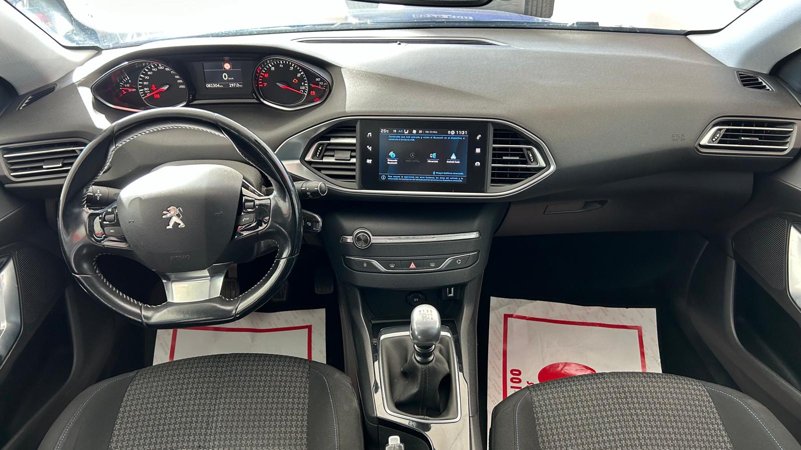 El interior del Peugeot 308 Style 2019 ofrece una combinación de materiales de buena calidad y acabados refinados, con un tablero limpio y minimalista que da una sensación moderna. Destaca el Peugeot i-Cockpit, que incluye un volante compacto y una instrumentación elevada, permitiendo una conducción más ergonómica y ágil. Incluye una pantalla táctil de 9,7 pulgadas con funciones de info-entretenimiento como navegación GPS, compatibilidad con Apple CarPlay y Android Auto, Bluetooth y cámara de marcha atrás.